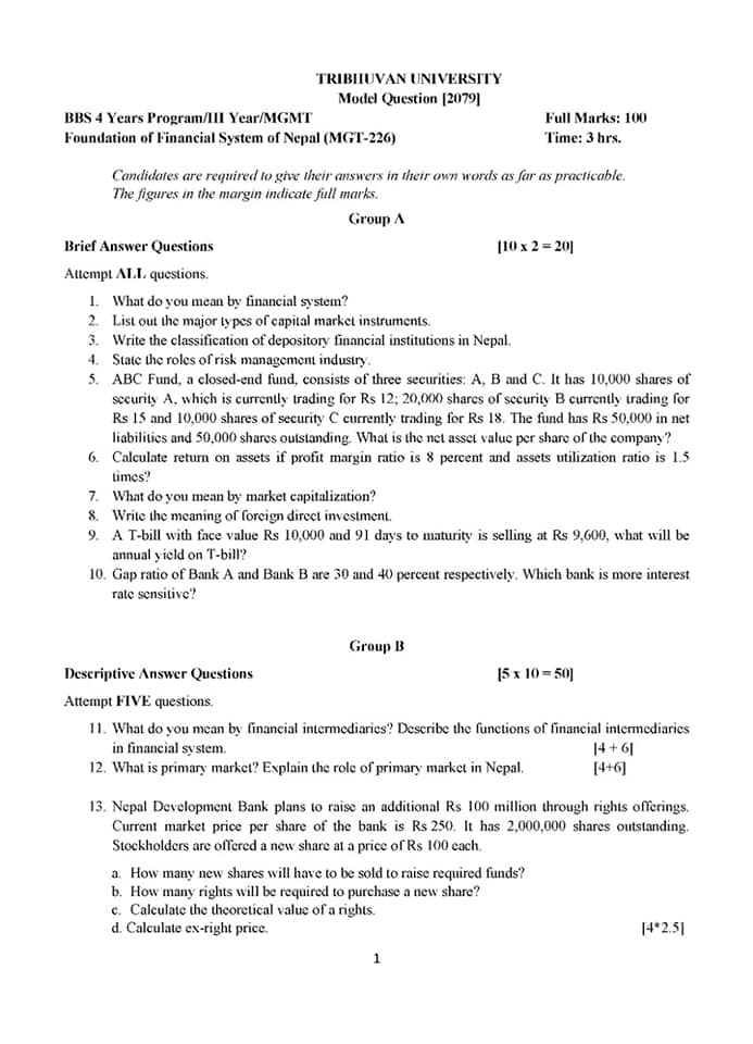 These model questions aim to assess the student's understanding of various concepts and principles related to financial systems, covering topics such as banking, financial institutions, monetary policy, financial markets, and other foundational aspects of the financial system. By practicing these model questions, students can enhance their knowledge, prepare for examinations, and strengthen their comprehension of the subject matter.