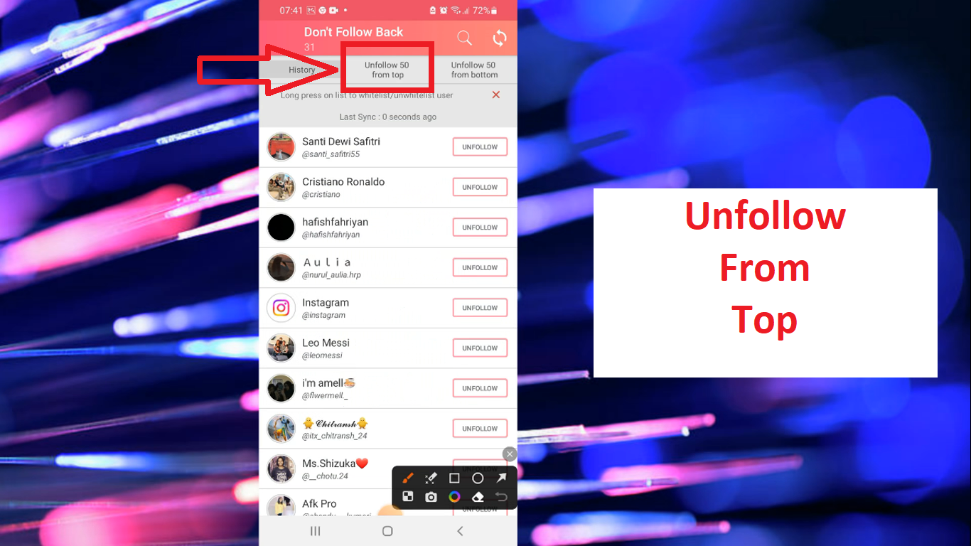 Login Successful! now you can see this type of UI in your device if you have logged in you can see a list of the following, you can check every following. you can see unfollow from the top & unfollow from bottom buttons at the top just click on Unfollow from the top and proceed, but this app has some limitations you can only follow 50 following at once,