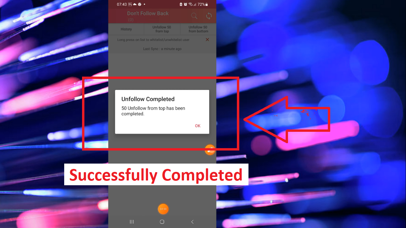 if will take some time to unfollow eg 2minutes .. etc. wait for some and you will see these completed messages, you can repeat the same process for the next 50 unfollows, but make sure you are not violating the Terms & Conditions of Instagram described in step 3 NOTE: